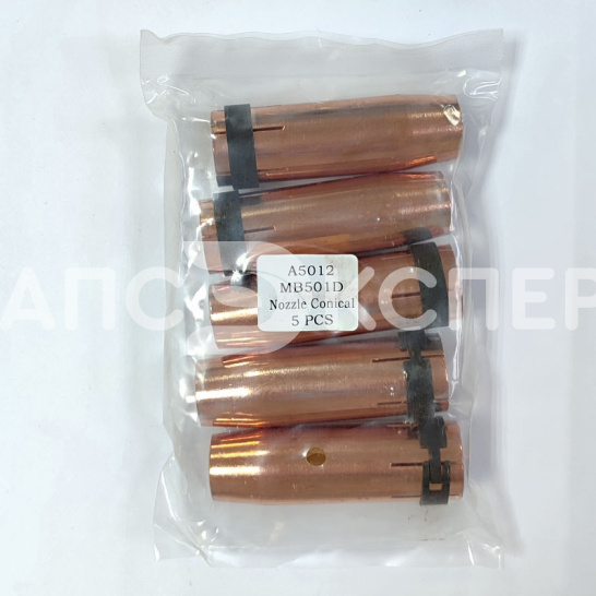 Сопло для MB-501 устанавливается на сварочную горелку и служит для равномерного распределения защитного газа при сварке и для защиты сварочного наконечника от случайного соприкосновения со свариваемой деталью. Используется в сварочных горелках серии MB-501D и ее аналогов. Материал изготовления - медь.